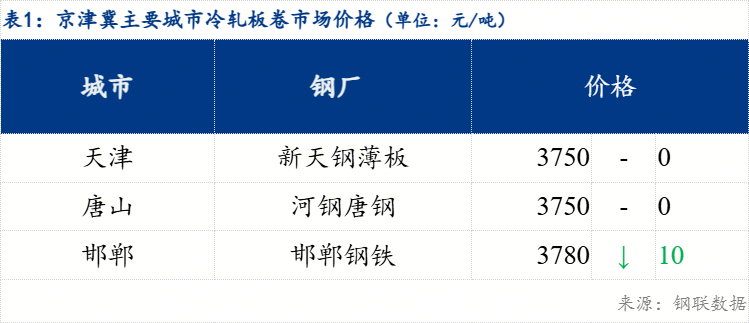 今日邯郸冷轧价格下跌10元/吨,现1.0mm天津新天钢薄板3750元/吨,唐山唐钢3750元/吨,邯郸邯郸钢铁(600001)3780元/吨。